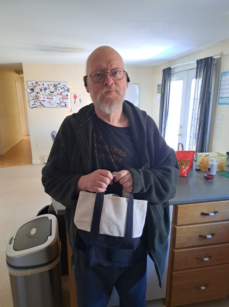 On this month’s trip, we made a plan so I could walk the Shore Path while Wal stayed in the car and listened to an audio book. We would then have lunch (seafood for him, a blueberry Margarita for me) and I would do a quick walk downtown. But first we had to pack a bag for Wal. We now call this little tote bag his “murse”–man purse. It’s filled with meds he might need, wallet, earbuds, charger, phone, and wool gloves for his eternally cold hands.